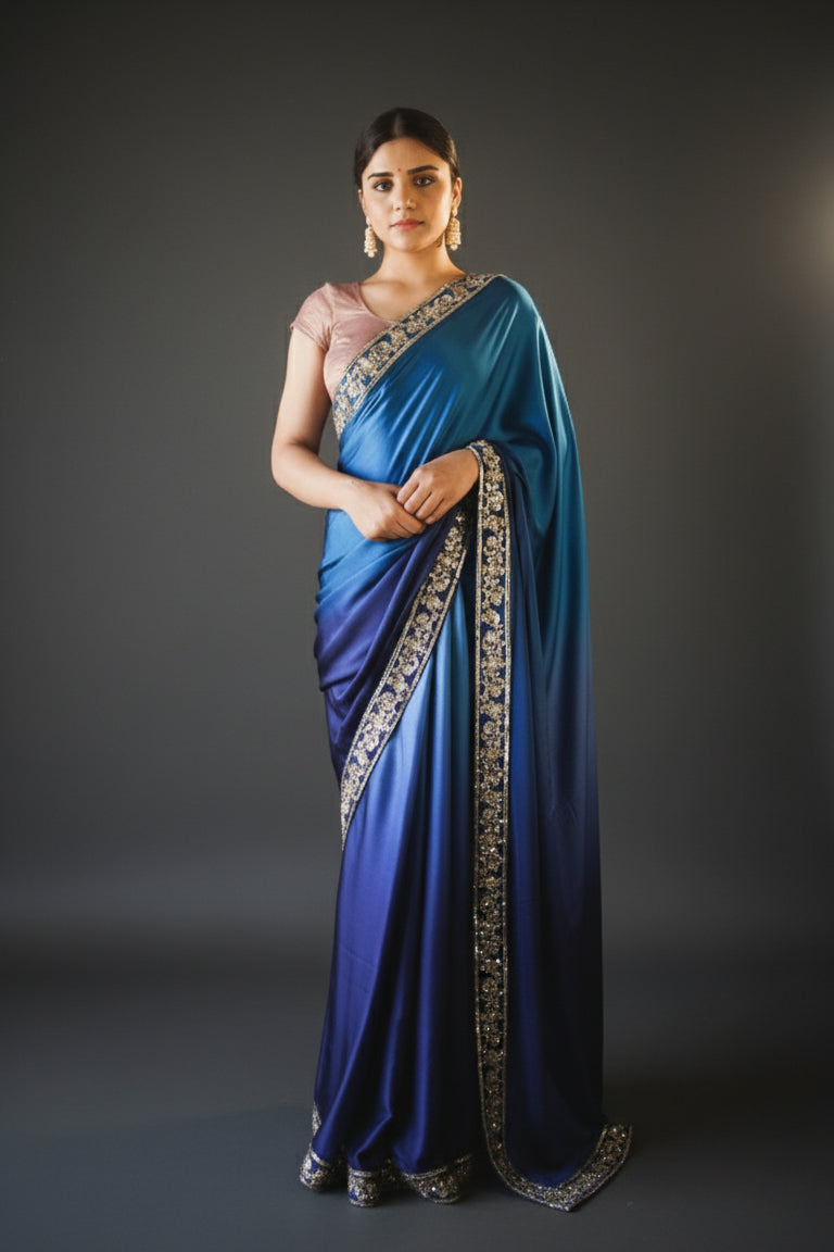 Indulge in luxury with our Ocean Blue Ombre Silk Satin Saree. Crafted from the finest quality silk satin, the sari features a stunning ombre dye in ocean blue, complemented by intricate champagne gold handcrafted zari embroidery adorned with beautiful Parsi floral motifs. With inspiration from the opulent Mughal era, this sari is a modern take on elegance and sophistication. Elevate your style with this exclusive and timeless piece.